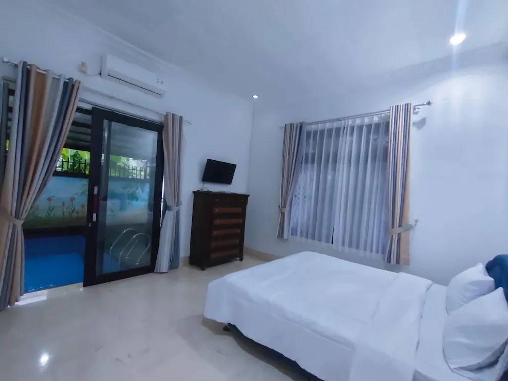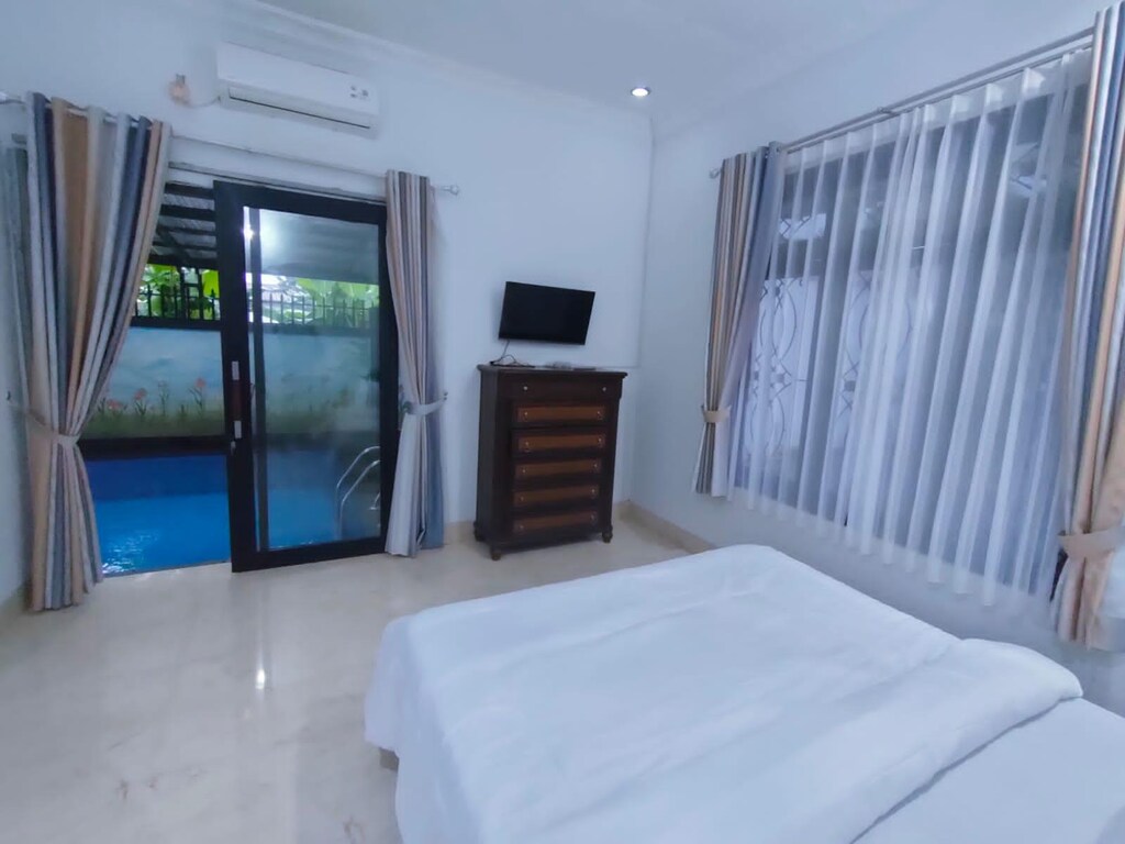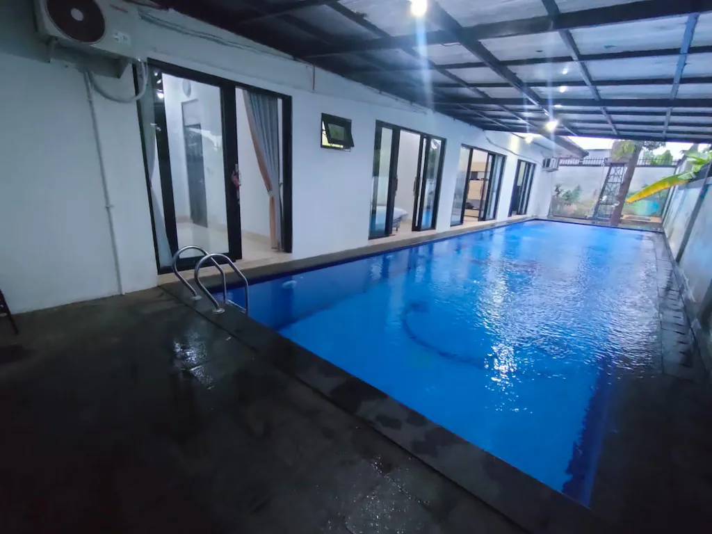 Fasilitas : Kolam renang pribadi (mini pool), peralatan dapur lengkap, rice cooker, microwave