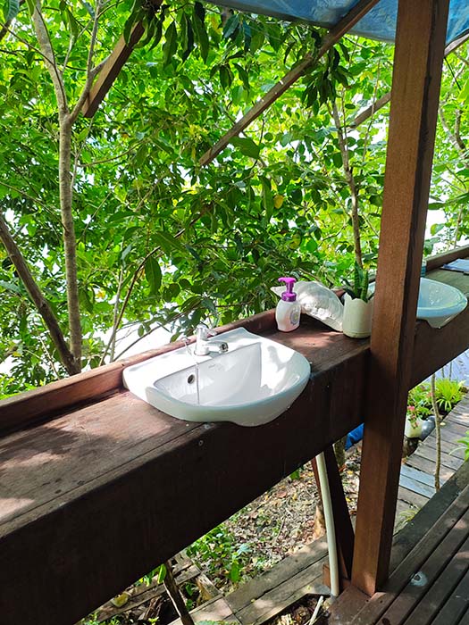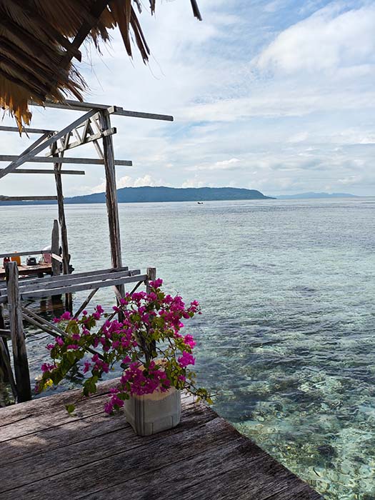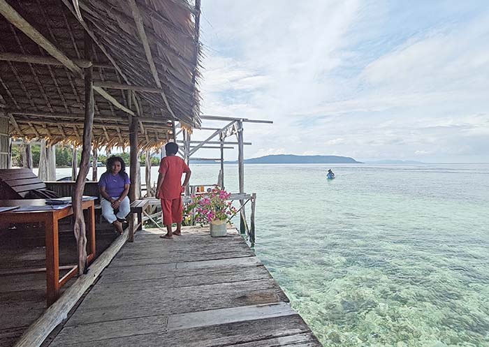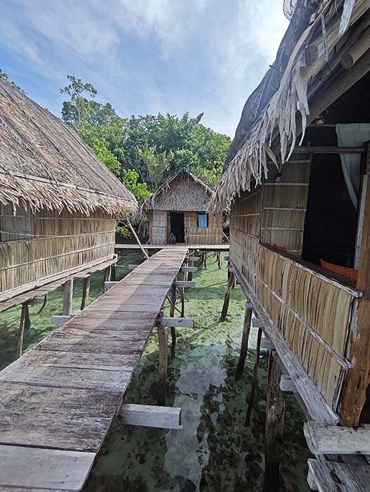 ` `Binn Betew Homestay memiliki tiga bungalow di atas air yang terletak di sebelah desa Kapisawar di Pulau Gam.