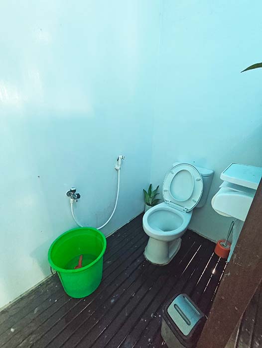 Para tamu menggunakan kamar mandi bersama yang terdiri dari kamar mandi dengan pancuran dan toilet bergaya barat di ruangan terpisah.