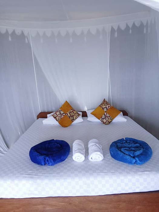 Kamar tidur dapat menampung dua orang di tempat tidur yang ditinggikan, dan bantal, guling, seprai, dan kelambu disediakan. Kasur tambahan dapat disediakan jika diperlukan. Kedua bungalow memiliki stop kontak untuk mengisi daya perangkat dan sakelar lampu kamar tidur.