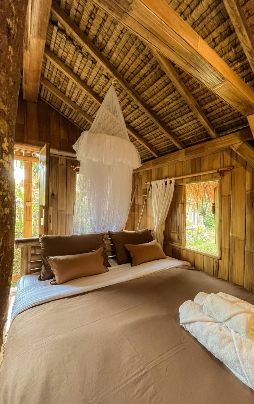 Terdiri dari sekitar 10 unit kabin bambu yang dilengkapi dengan meja, perlengkapan mandi gratis, serta kamar mandi pribadi dengan fasilitas air panas dan dingin. Sangat di rekomendasikan untuk petualang dan pecinta alam.