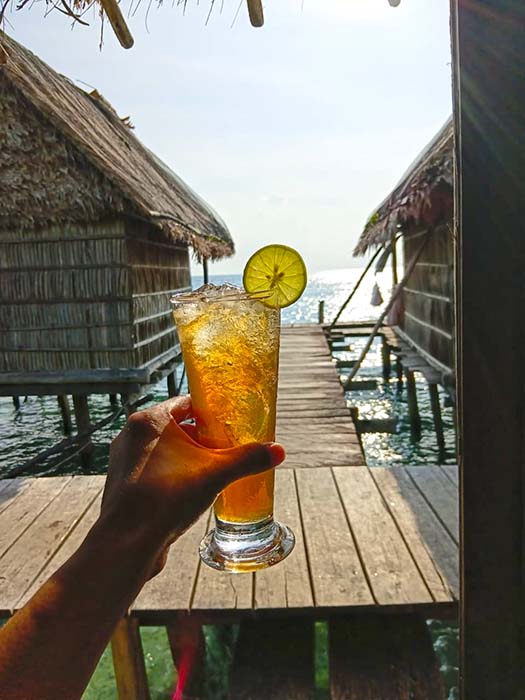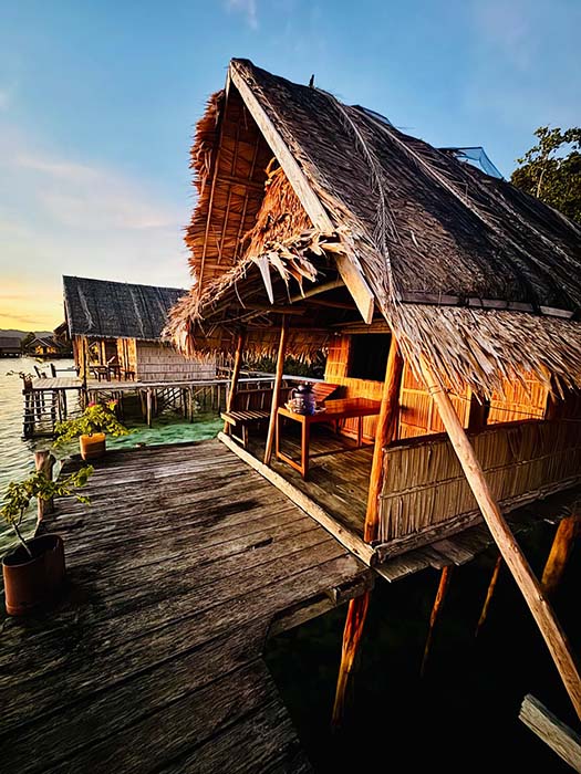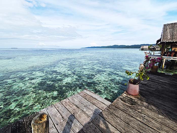 ` `Binn Betew Homestay memiliki tiga bungalow di atas air yang terletak di sebelah desa Kapisawar di Pulau Gam.